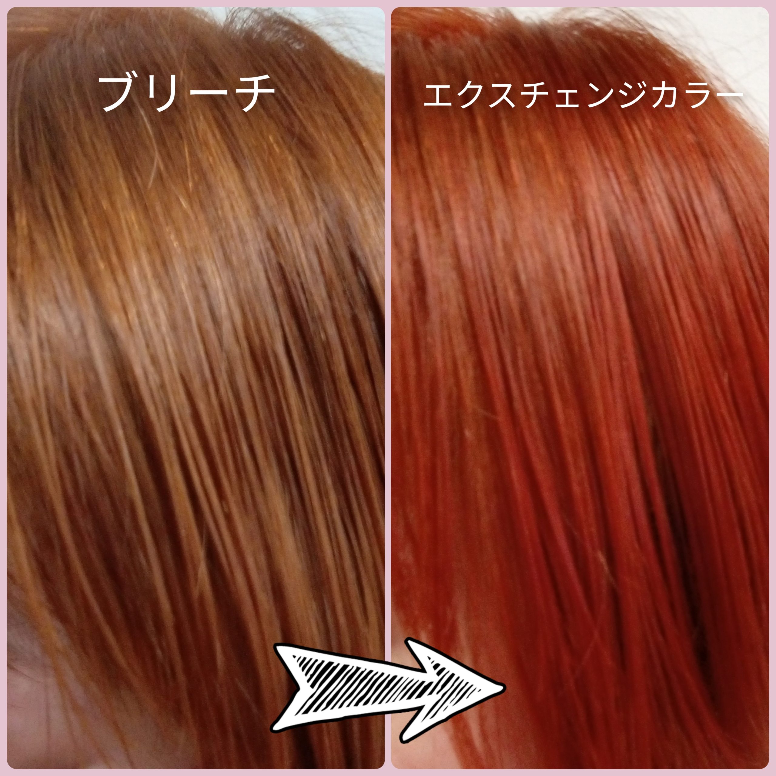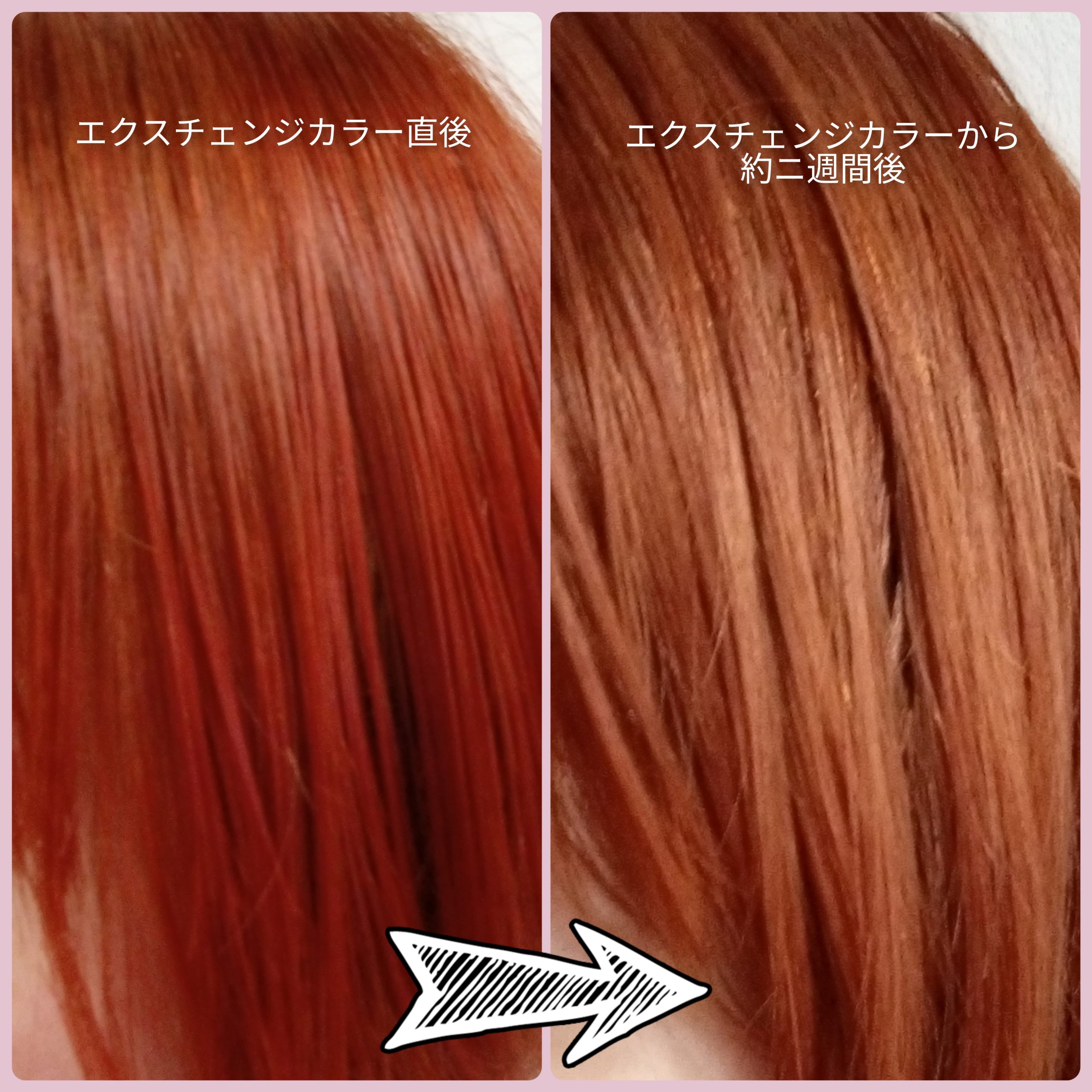 エクスチェンジカラーで染めてから2週間経った髪色と脱染後の髪色の変化を見てみました。