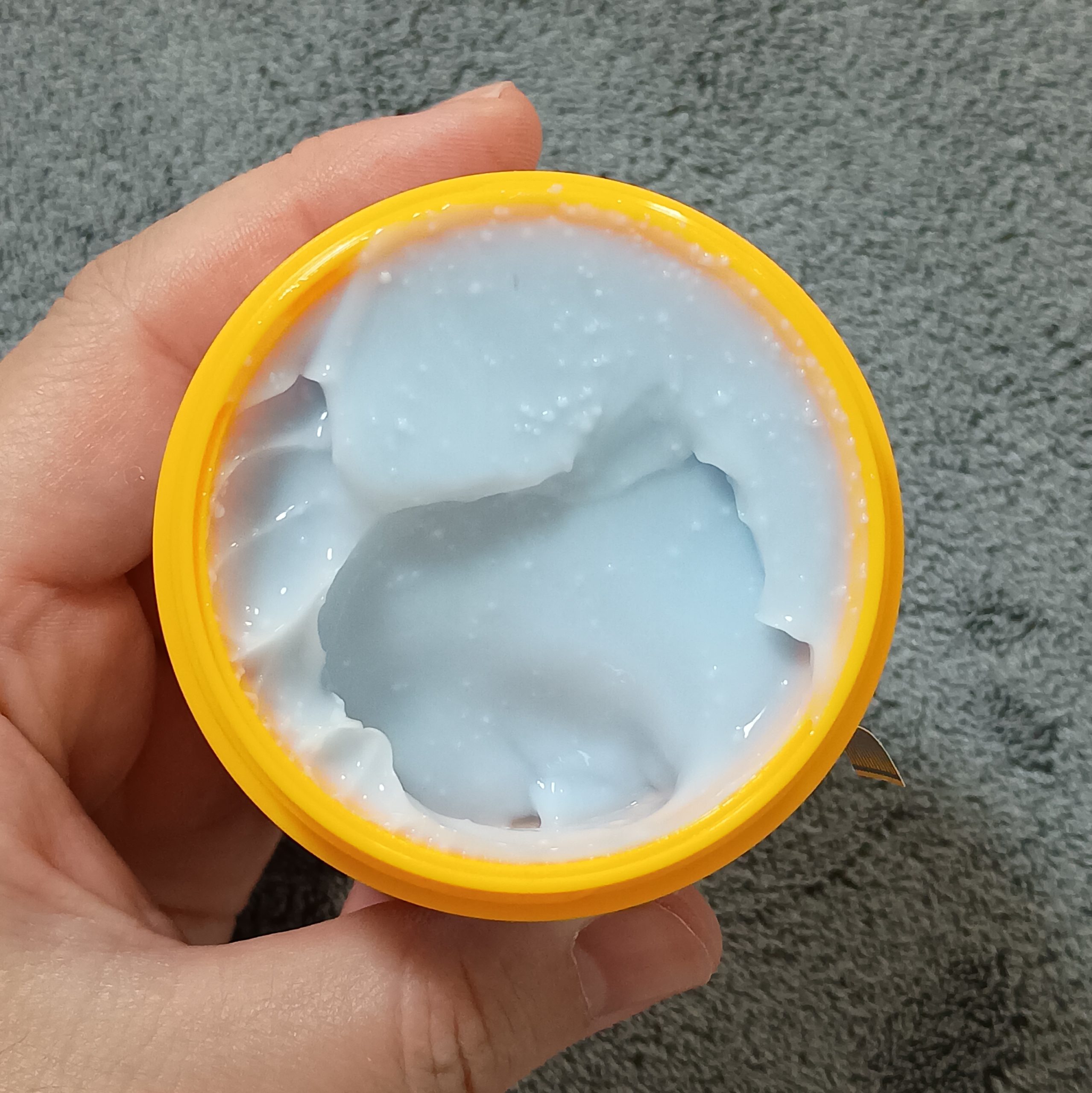 水色っぽいクリームに白い粒々がたくさん入っています。
