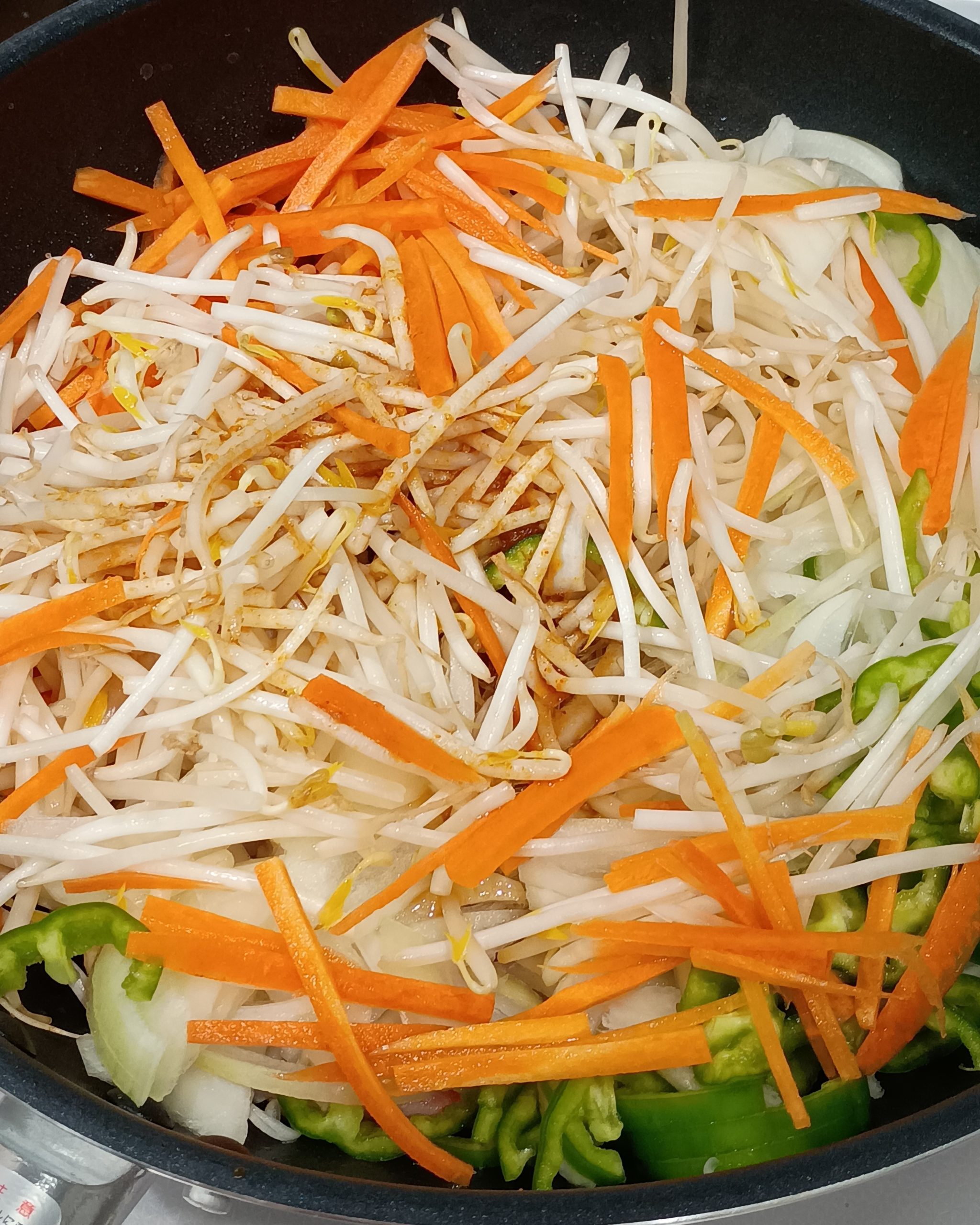 もやし、にんじん、たまねぎ、ピーマンなど好きな野菜をたっぷり入れると
